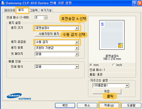 | 9. ¿ëÁö Å©±â´Â ·ÎÁ¨¼ÛÀåA , ¿ëÁö°ø±Þ¿øÀº ¼öµ¿ ±ÞÁö·Î ¼±Åà ÈÄ Àû¿ë¹öưÀ» ´©¸¨´Ï´Ù. |